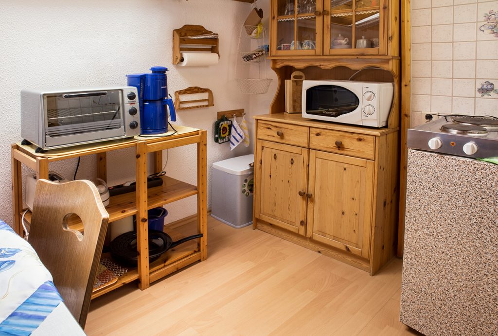 Küche mit Esstisch, Kühlschrank, Kochgelegenheit, Toaster, Elektrogrill, Kaffeemaschine, Wasserkocher.